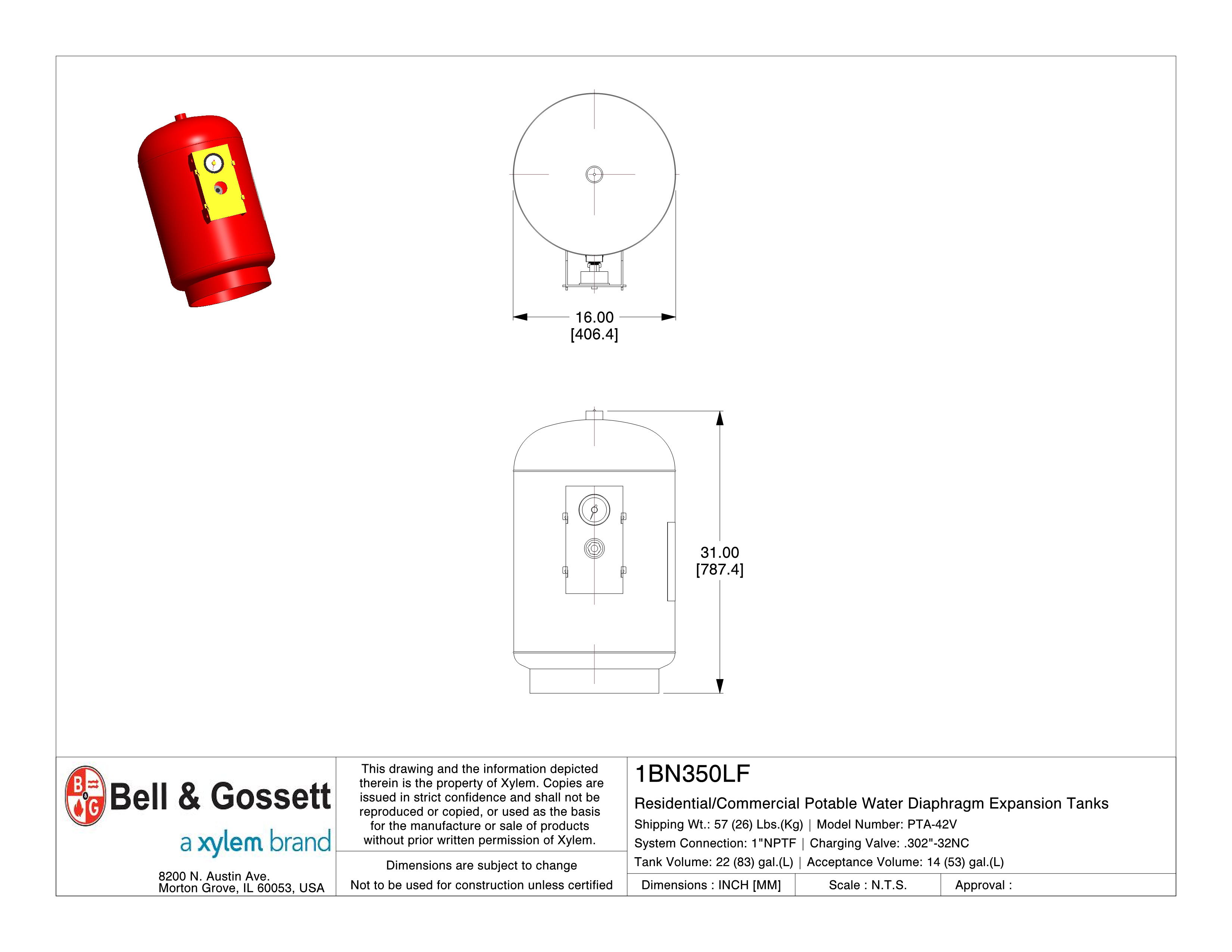 | Description | PTA-42V Potable Water Diaphragm Tank |